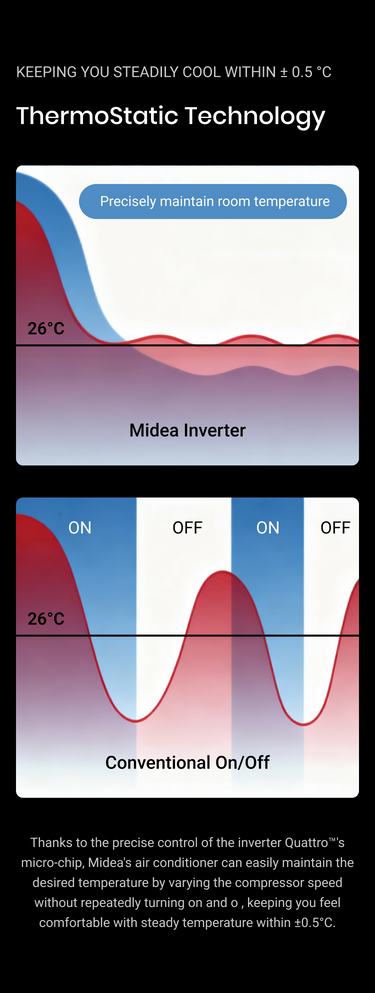 Thanks to the precise control of the inverter Quattro™'s micro-chip, Midea's air conditioner can easily maintain the desired temperature by varying the compressor speed without repeatedly turning on and o , keeping you feel comfortable with steady temperature within ±0.5°C.