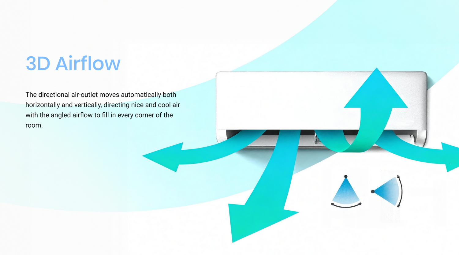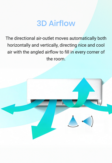 The directional air-outlet moves automatically both horizontally and vertically, directing nice and cool air with the angled airflow to fill in every corner of the room.